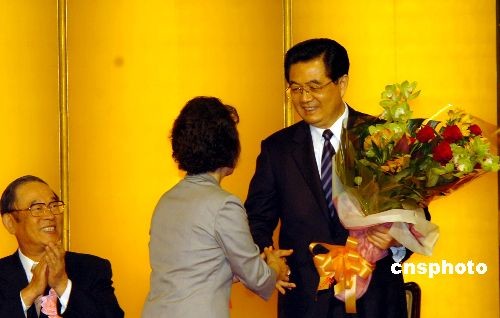 5月8日午间,正在日本进行国事访问的中国国家主席胡锦涛出席了日中协会等日本七团体和四侨团联合举行的欢迎宴会,1300名日本各界人士出席了这一活动。图为胡锦涛在欢迎宴会上接受献花。 中新社发 朱沿华 摄