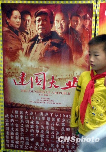 据中国电影集团公司披露,由张国立、唐国强、邬君梅等172位明星参演的国庆60周年献礼巨制影片《建国大业》于9月16日下午在全国影院首映,上映一天半票房已超4500万元,预计其首周末票房有望突破亿元大关。图为湖北宜昌解放电影院,《建国大业》电影海报。 中新社发 刘君凤 摄