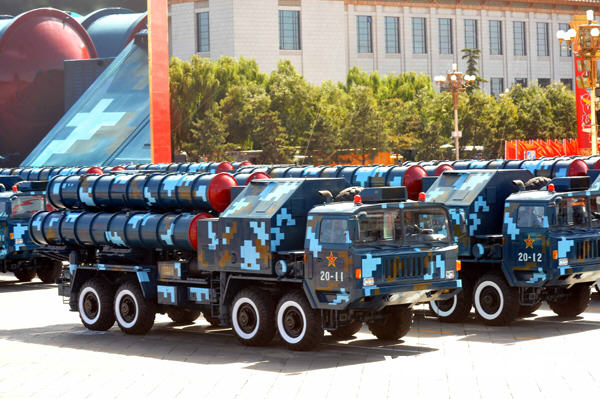 10月1日,首都各界庆祝中华人民共和国成立60周年大会在北京举行。这是红-9地空导弹方队通过天安门广场。新华社记者李晓果摄