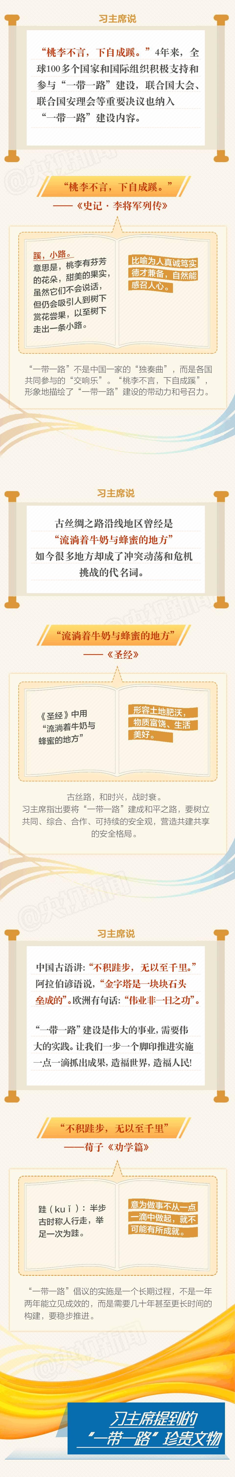 习主席在讲话中引经据典,通过大量的古文经典、名人名言,介绍了“一带一路”承载的厚重历史,描绘了“一带一路”美好的发展愿景,透出浓浓书香味,展现了一个富于深沉文化意蕴的中国形象。