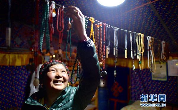 珠穆朗玛峰旅游逐步成为当地支柱产业,越来越多的农牧民从事旅游业,受益于所得税优惠政策,收入增加。图为来自珠峰脚下扎西宗乡的卓玛在自家的帐篷旅馆内整理旅游纪念品(5月19日摄)。新华社记者普布扎西摄