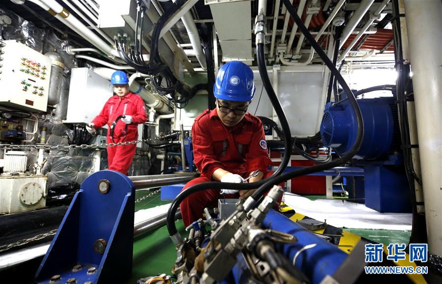 3月13日,“科学”号技术支撑人员丛石磊(右)在绞车舱里检修阻尼器。雄伟的红色吊臂矗立在船舯,高大的红色吊架安装在船尾,大大小小红色仪器错落有致摆放在甲板。第一次登上“科学”号,第一眼就被船上的“红色风景线”吸引。深入采访后,方知船上还有一支专业的技术支撑团队,精心守护着这些红色的仪器设备。新华社记者张建松摄