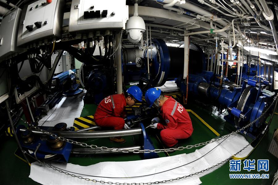 3月13日,“科学”号技术支撑人员在绞车舱里检修设备。雄伟的红色吊臂矗立在船舯,高大的红色吊架安装在船尾,大大小小红色仪器错落有致摆放在甲板。第一次登上“科学”号,第一眼就被船上的“红色风景线”吸引。深入采访后,方知船上还有一支专业的技术支撑团队,精心守护着这些红色的仪器设备。新华社记者张建松摄
