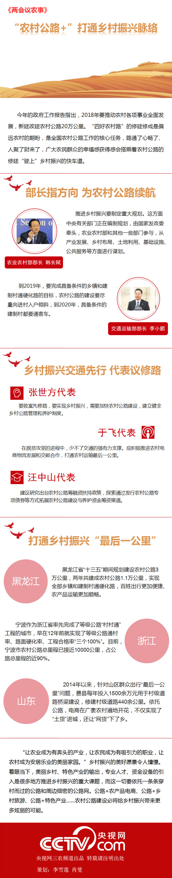 央视网消息:“要想富,先修路”——这句老口号在今天仍然有重要的意义。要实施乡村振兴战略,加快农村公路修建,建立健全乡村公路管理和养护制度是基础也是前提。只有交通便利,社会资源才能与农村资源进行交换,才能助推解决偏远地区贫困问题,推动乡村的全面振兴。如何确保农村基础设施建设持续加强,偏远贫困地区道路通畅,真正实现公路“村村通”?小编带您一起,全息两会各界声音,全景各地实施情况。