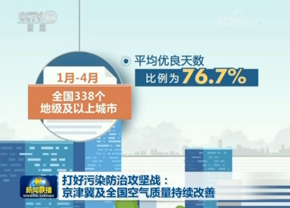 央视网消息(新闻联播):环境就是民生,蓝天也是幸福。通过坚持全民共治、源头防治等措施,全国空气质量总体改善,今年1至4月京津冀区域效果尤为明显。
