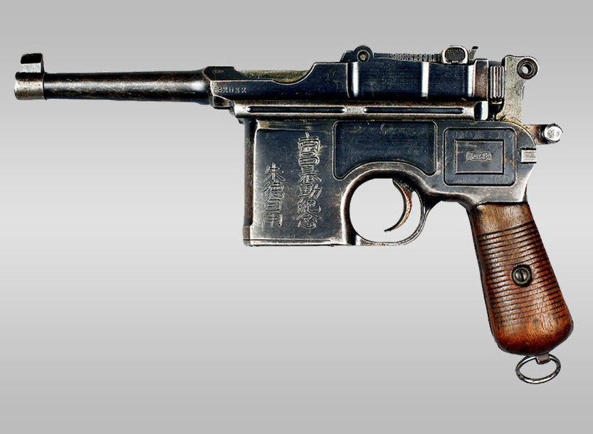 朱德在南昌起义期间使用的警用型德国毛瑟短管M96手枪。起义后,朱德在手枪上刻上了“南昌暴动纪念朱德自用”以作留念。现存中国人民革命军事博物馆