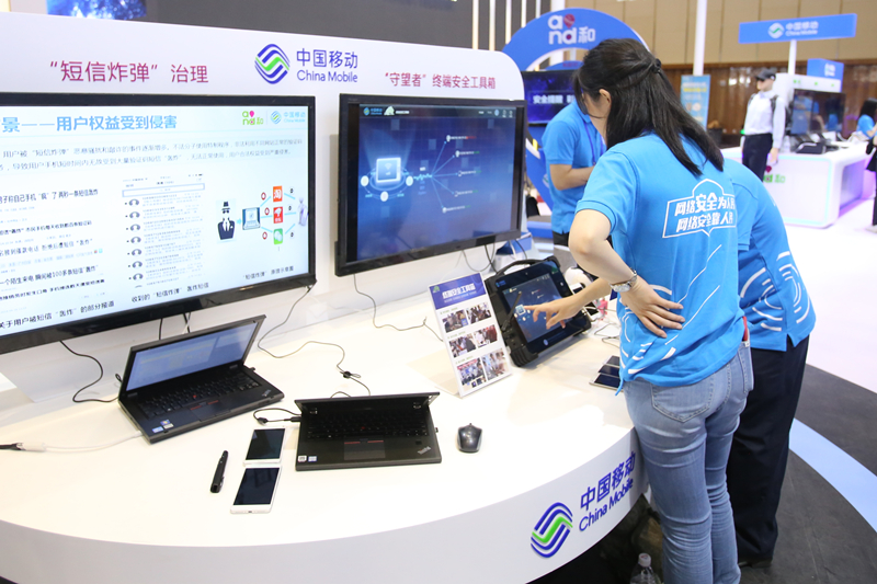 图为2018年网络安全博览会上展商演示网络安全防护技术。中国网信网李旭摄