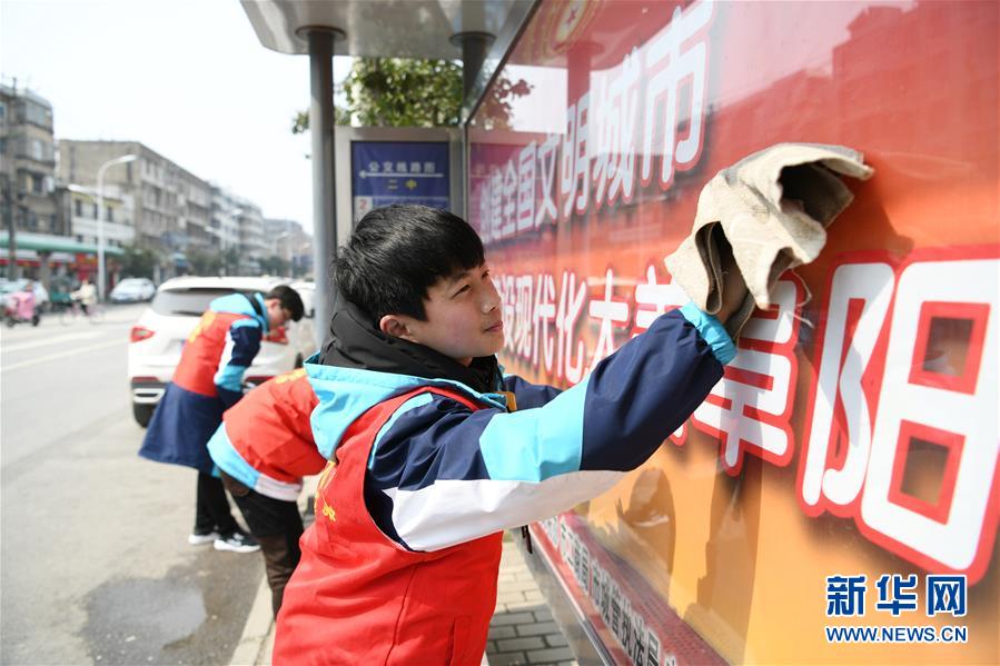 3月4日,中学生志愿者在安徽阜阳市文峰路公交车站台擦洗站台橱窗。