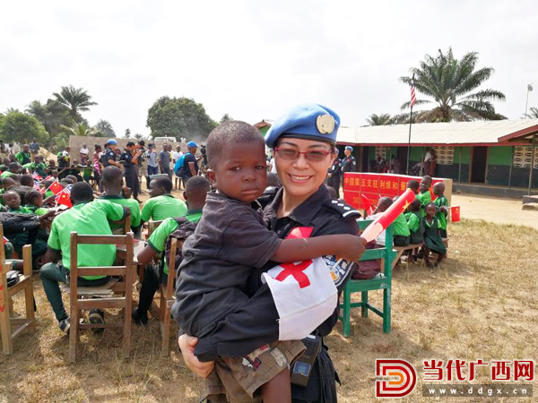 李丽梅抱起自己曾经医治过的利比里亚儿童。广西北海市公安局海防管理支队供图