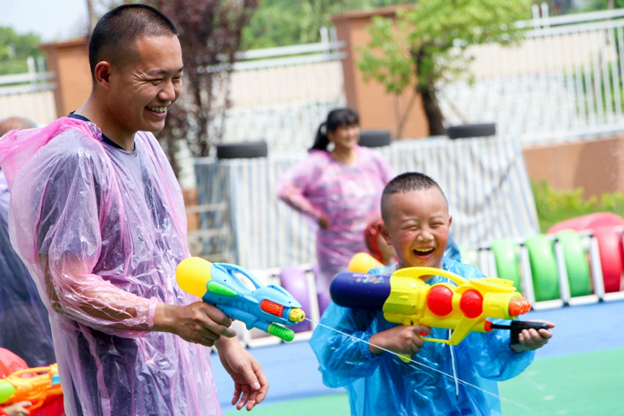 6月14日,浙江省长兴县林城镇中心幼儿园的孩子和父亲一起玩游戏。