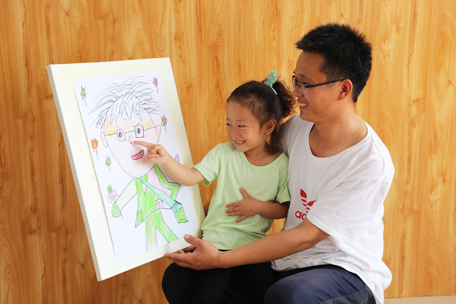 6月14日,河北省唐山市丰润区迎宾路幼儿园吴雨桐小朋友将绘画作品送给父亲作为节日礼物。新华社发(朱大勇摄)