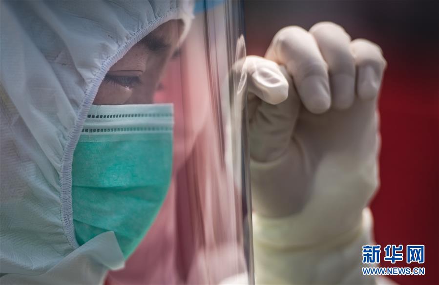 3月8日,武汉体育中心方舱医院送走了最后61名康复的患者,正式休舱。这是来自贵州医疗队的叶青与康复的患者分别时落泪,她试图擦拭泪水。新华社记者肖艺九摄