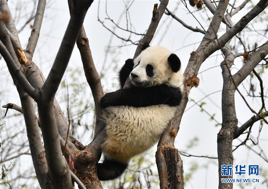 3月31日,在陕西省林业科学院秦岭大熊猫繁育研究中心,大熊猫“秦酷儿”在树上玩耍。 2019年,三只大熊猫幼崽“佳佳”“园园”“秦酷儿”在陕西省林业科学院秦岭大熊猫繁育研究中心出生,在工作人员的悉心照料下,三只大熊猫宝宝健康成长。新华社记者张博文摄