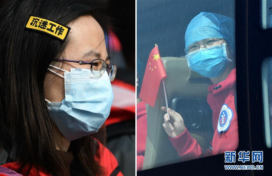 拼版照片左图:2月8日,西安交通大学第二附属医院援鄂国家医疗队队员孔淑贞在出征仪式上,她的头发上别着同事赠送的“沉迷工作”字样的发卡;右图:3月31日,西安交通大学第二附属医院援鄂国家医疗队队员孔淑贞向迎接人员致意。 3月31日,西安交通大学第二附属医院援鄂国家医疗队完成使命,乘坐包机抵达西安咸阳国际机场。新华社记者李一博摄