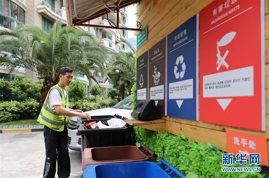 在上海市虹口区嘉兴路街道“宇泰景苑”小区,保洁工对居民分类投放的生活垃圾进行分拣(2019年6月24日摄)。这是中国越来越美的五年——蓝天越来越多,江河越来越清,生态越来越好……“十三五”期间,我国生态环境显著改善,人民群众的生态环境获得感、幸福感和安全感不断增强。新华社记者方喆摄