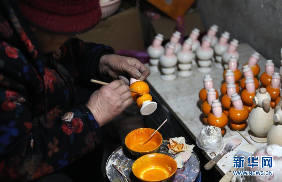 1月16日,山东省临沂市郯城县港上镇樊埝后村村民袁宗凤在给木旋玩具上色。新华社发(张春雷摄)