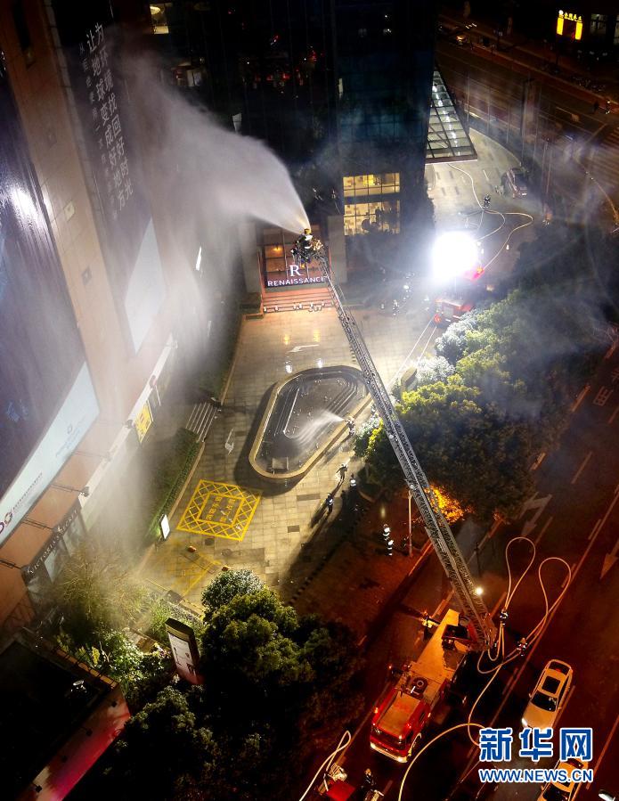 1月16日,消防员对发生“火情”的商场实施高空灭火救援(无人机照片)。