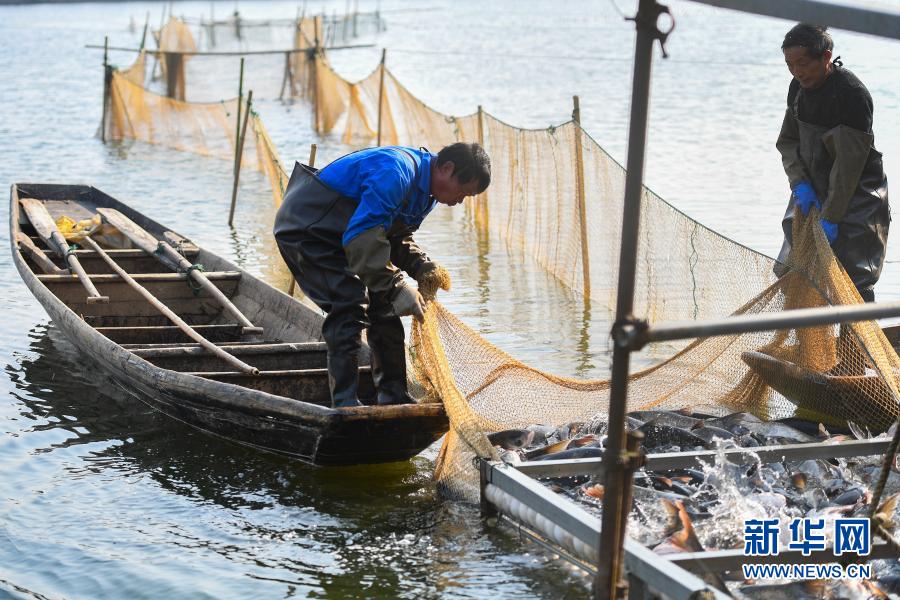 1月15日,在湖南省益阳市资阳区黄家湖渔场,工作人员在进行捕鱼作业。