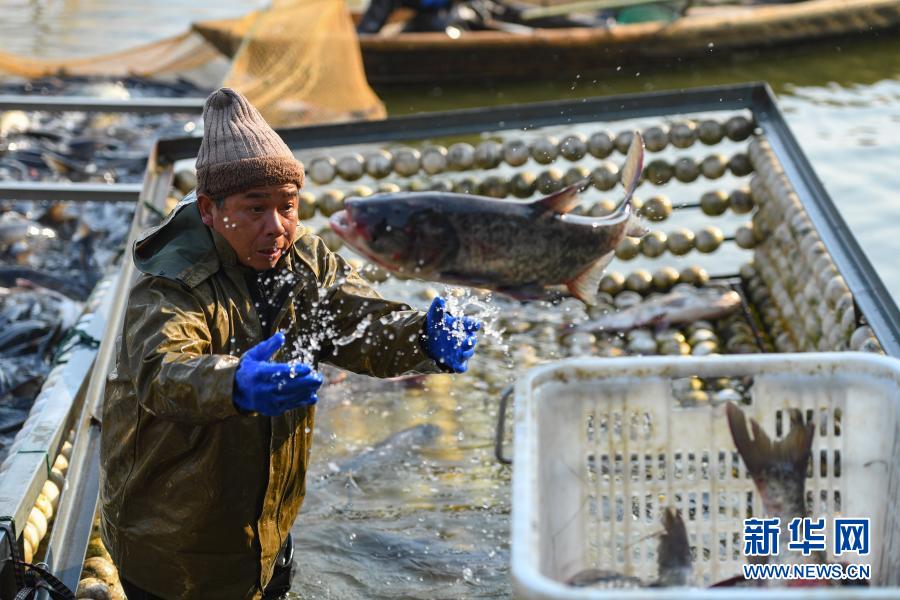 1月15日,在湖南省益阳市资阳区黄家湖渔场,工作人员将捕到的鱼放入鱼筐中。