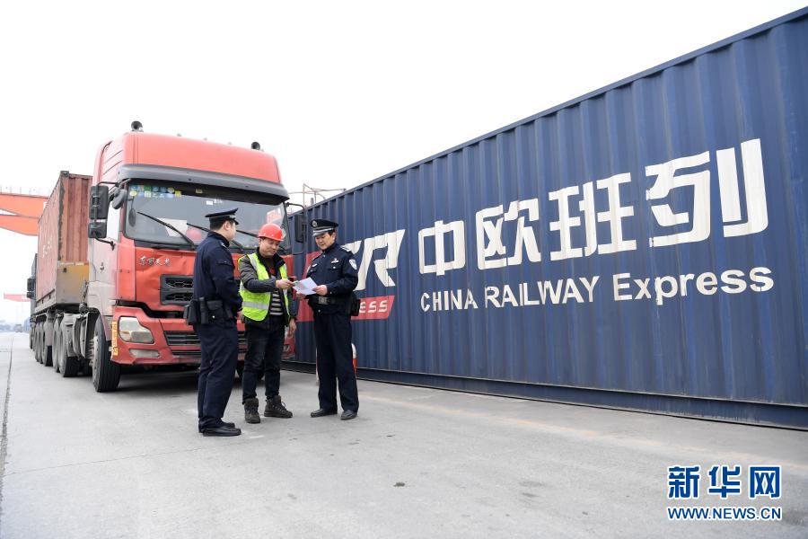 春运期间,中欧班列的运输任务仍旧繁忙,2021年2月8日,民警雷激(右一)和同事在重庆团结村中心站货场对货车进行例行安全检查。重庆团结村中心站是中欧班列(渝新欧)起点站。开行10年以来,中欧班列(渝新欧)累计开行中欧班列超7000列。新华社记者唐奕摄