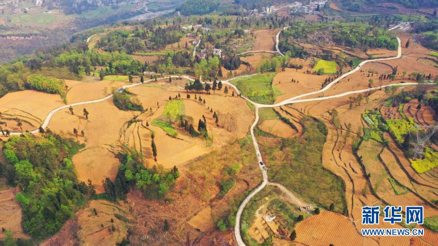 贵州省六枝特区大箐村的产业路四通八达,这里是倪裔豹驻村的“最后一岗”(2020年3月24日摄,无人机照片)。新华社记者刘勤兵摄