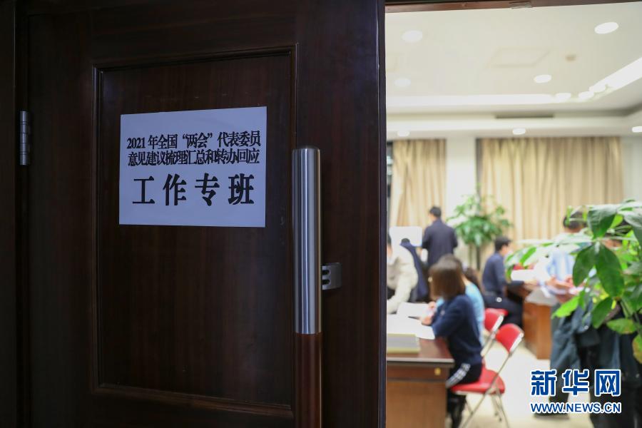 3月5日,2021年全国两会代表委员意见建议梳理汇总和转办回应工作专班的工作人员在忙碌。新华社记者李木子摄