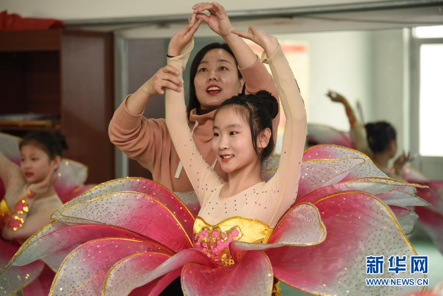 3月17日,河北省河间市第一实验小学学生在老师指导下练习舞蹈。