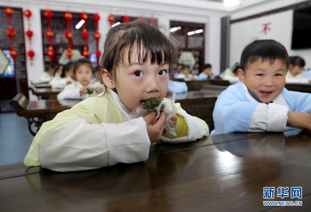 3月31日,小朋友在国学大讲堂上品尝青团。