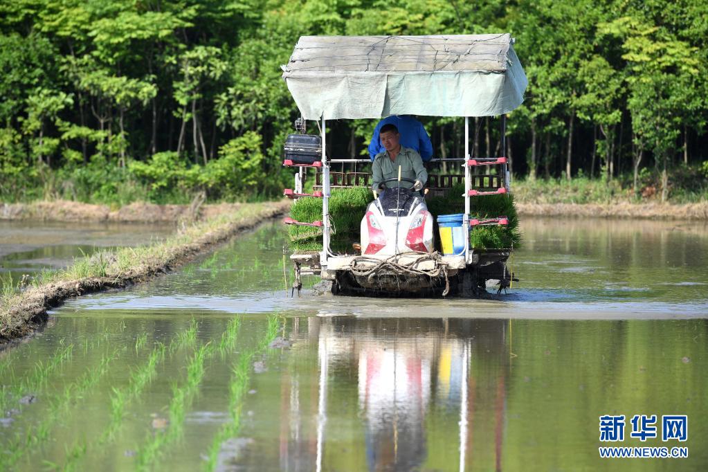 初夏时节,在安徽省合肥市肥西县花岗镇,当地农民抢抓农时在田间地头忙插秧。