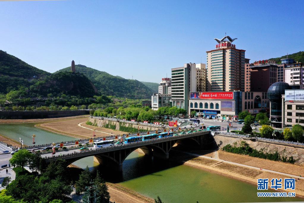 5月9日拍摄的延安宝塔山和延河大桥(无人机照片)。新华社记者刘潇摄