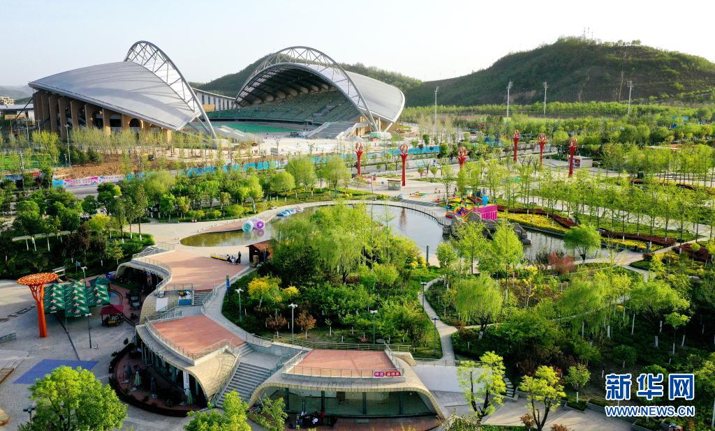 5月8日拍摄的延安新区文化公园(无人机照片)。新华社记者刘潇摄