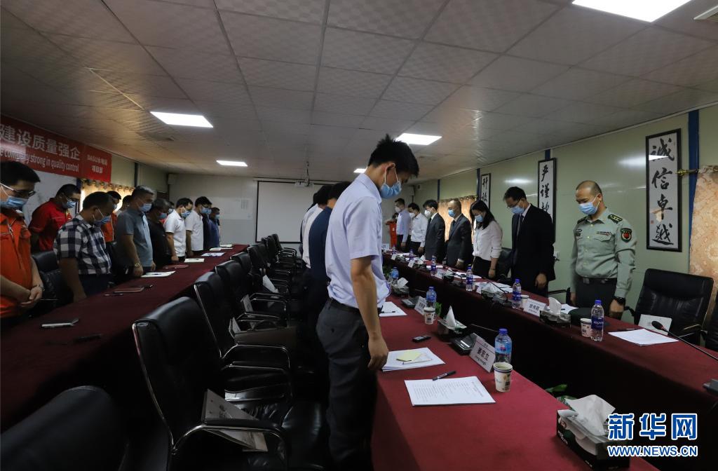 7月17日,中国赴巴基斯坦跨部门联合工作组组长、外交部涉外安全司副司长吴伟(右排右五)与中国驻巴大使农融(右排右四)等在中企承建的达苏水电站项目部驻地,看望慰问广大干部职工,并默哀。新华社记者蒋超摄