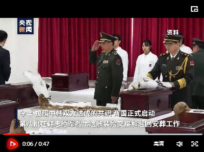 中韩双方将于9月1日在韩国仁川共同举行烈士遗骸装殓仪式,2日上午在韩国仁川国际机场举行交接仪式。运送志愿军烈士遗骸的专机抵达沈阳后,退役军人事务部会同相关部门将于2日上午在辽宁沈阳桃仙国际机场举行烈士遗骸迎回仪式,9月3日上午在沈阳抗美援朝烈士陵园举行安葬仪式。中央和地方国家机关干部代表,解放军和武警部队官兵代表,志愿军烈士家属和社会各界代表等将参加仪式。(总台央视记者徐静)