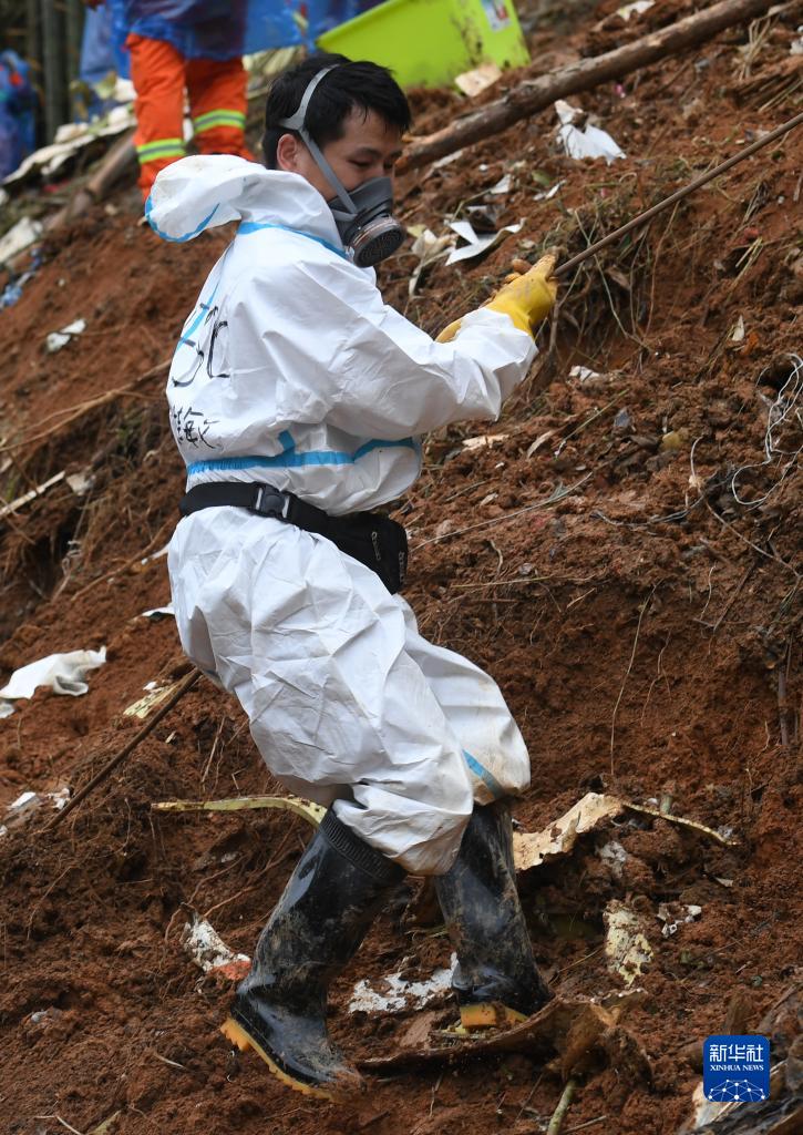 3月26日雨后,在藤县空难救援现场,消防救援人员在雨后的淤泥中开展搜寻作业。淤泥没过了他们的膝盖,但搜寻的脚步并未停止。搜救人员腰间系着安全绳进行搜索(3月26日摄)。新华社记者陆波岸摄