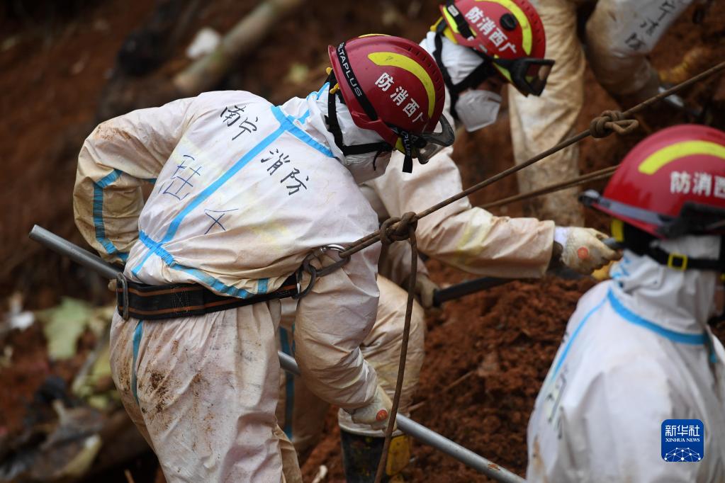 搜救人员腰间系着安全绳进行搜索(3月26日摄)。