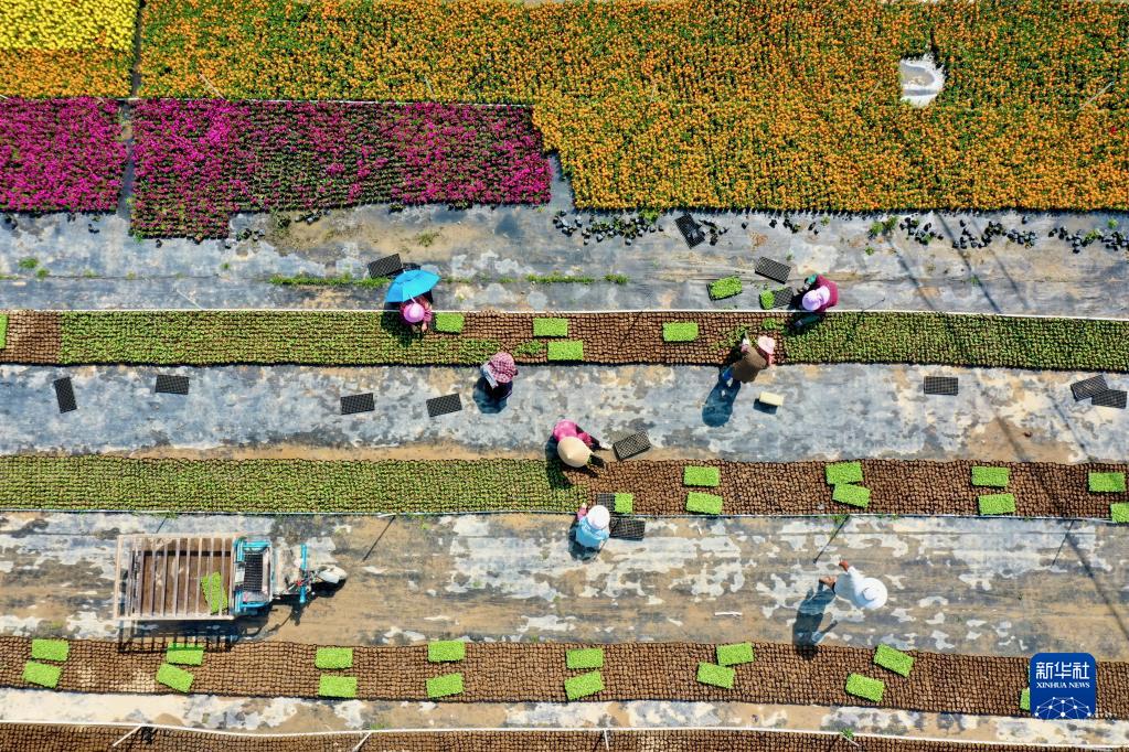 4月12日,福建省福州市闽侯县南通镇蔬菜花卉种植基地的花农在种植花卉(无人机照片)。