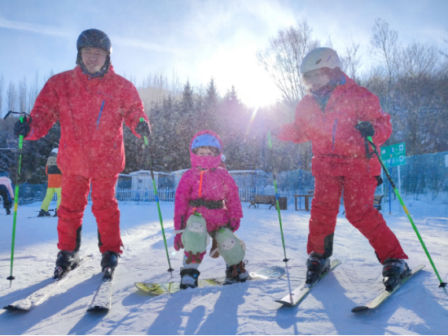 安徽小朋友江语星(中)和父母在长白山滑雪时留影新华社发